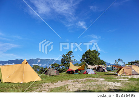 7月半ば(夏)・午前中、陣馬形山キャンプ場に張られたテント群 長野県上伊那郡中川村