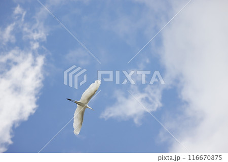 青空バックに飛翔するダイサギ