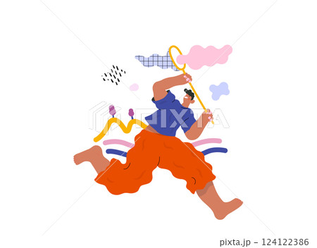 Life Unframed: Cloud catcher -modern flat vector concept illustration of running man with butterfly net. Metaphor of unpredictability, imagination, whimsy, cycle of existence, play, growth, discovery