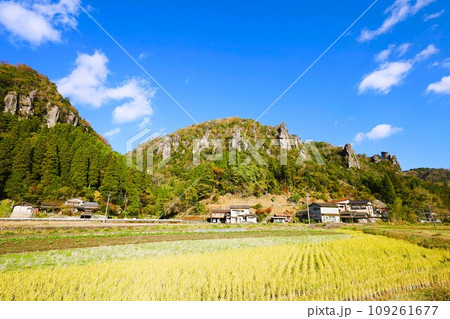 収穫期を迎えた水田の黄金色の稲穂と大山の風景