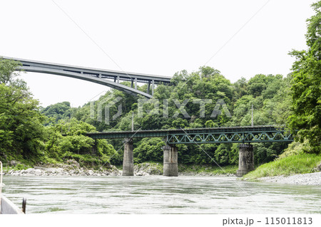 天竜峡、川下りの船上から望む橋梁