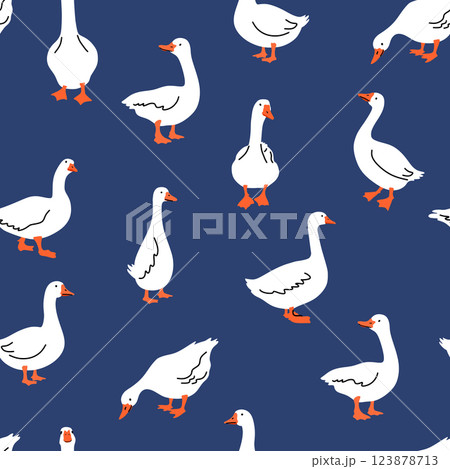 Seamless pattern with cute white gooses. Domestic and wild ducks on farm. Hand drawn print. Perfect for fabric, package paper, wallpaper, postcards. Vector illustration in flat cartoon style