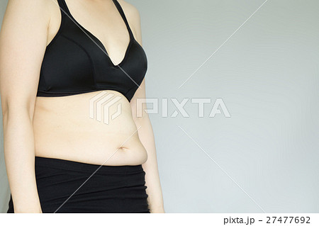 お腹の贅肉を気にする、お腹が出た悩む女性のイメージ素材