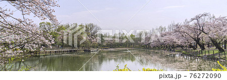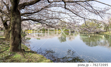 桜が満開の春の池(太田ヶ谷沼)/鶴ヶ島市運動公園(埼玉県鶴ヶ島市)
