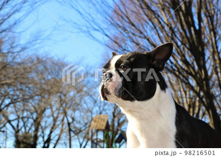 四季を通じて憩いの鶴ヶ島市運動公園の青空と木立の中で景色を眺める可愛いボストンテリアのマイティ君♡