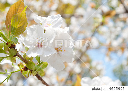 青空を背景として、太白(タイハク)と推定されるサクラの樹の枝の花をローアングルで撮影した写真