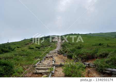 草原の木道を歩く登山者