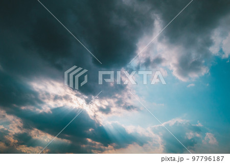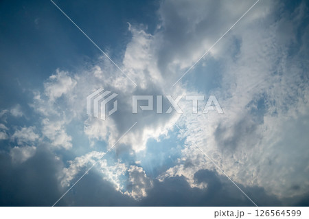 太陽が雲に隠れて光の帯が青空に伸びている光景