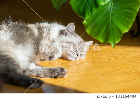 Siberian Neva Masquerade cat sleeping on parquet floor