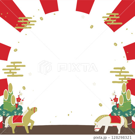 午年の年賀状などに使える馬と正月飾りなどの金・銀・赤のイラスト