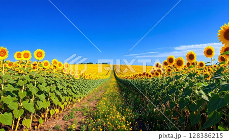 ヒマワリ畑の丘と細い道