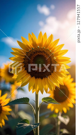 青空に向いて太陽光をいっぱい浴びる向日葵の花