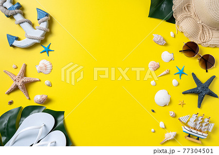 Sun glasses sea shells bright yellow background. Concept summer holidays travel.