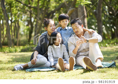 asian family with two children having fun sitting on grass talking chatting outdoors in park