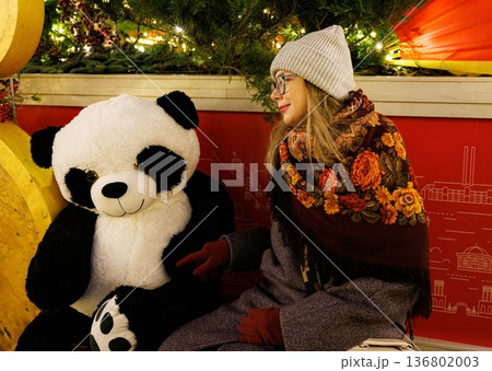 Creating joyful memories with a friendly panda plush during a winter evening in a festive setting