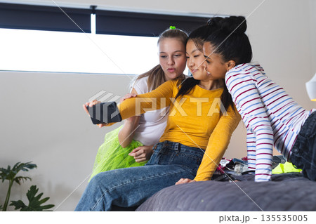 Teen girls taking selfie together on bed, enjoying fun moments at home