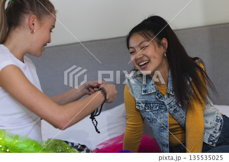 Teen girls sharing jewelry and laughing together while sitting on bed