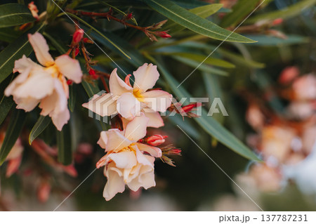 Pink flowers of poisonous oleander plant in Cyprus with bokeh background