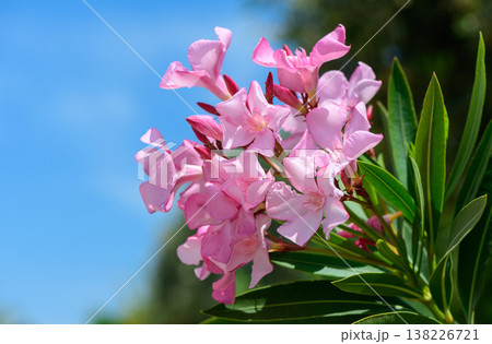 Beautiful pink oleander flowers blooming on a branch against a clear blue sky. Vibrant summer nature background with delicate petals and fresh green leaves.