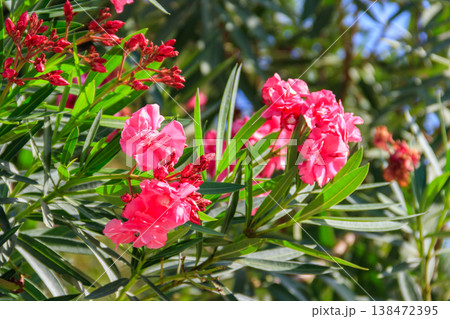 Blooming pink oleander flowers with green leaves in natural sunlight. Floral background, summer garden plant, tropical beauty, decorative blossom