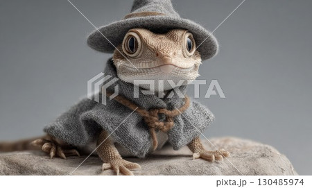 Cute bearded dragon in a wizard hat and cloak sits on a rock looking wise and magical in a fantasy setting. Fairytale Halloween background