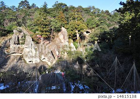 冬の加賀の観光地、雪降る那谷寺の奇岩遊仙境、縦構図