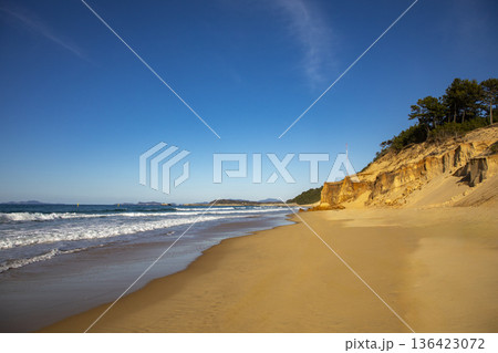 福岡市の雁ノ巣砂丘と海の打ち寄せる白波がある風景