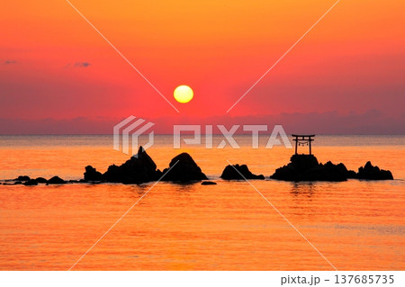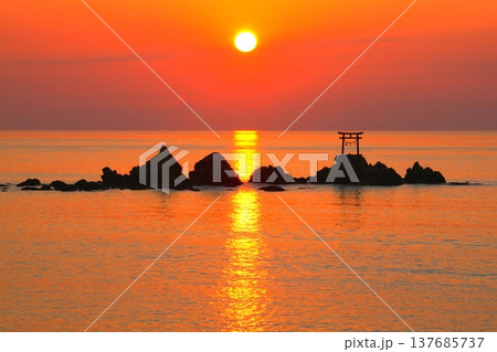 大分県国東半島奈多海岸の海中鳥居の日の出