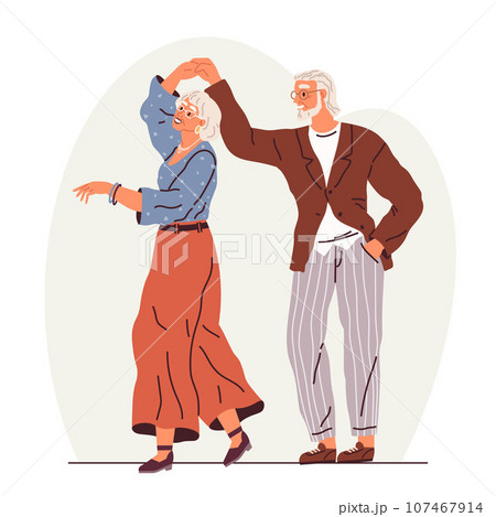 Old people dancing. Vector illustration. Man and woman hold hands and demonstrate dance moves. Grandma and grandpa at the dance. Retired senior couple dancing together. Aged people having fun