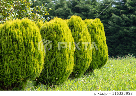 Close-up view of Thuja in the garden. Evergreen dwarf tree with a well-defined main trunk and many side branches.