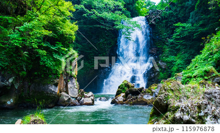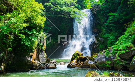 秋田県にかほ市の初夏 新緑の奈曽の白滝