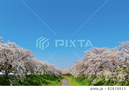 2024春佐保川の桜 佐保川の両岸を彩るさくらの花と真っ青な空