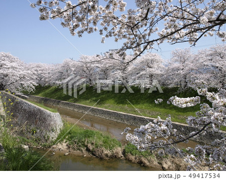 2024春佐保川の桜 佐保川左岸を彩る桜の花と真っ青な空