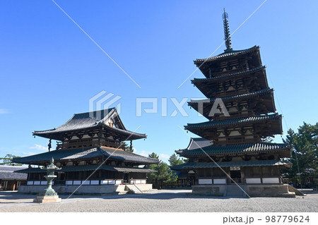 奈良県斑鳩の里の世界遺産 法隆寺国宝 五重塔と金堂