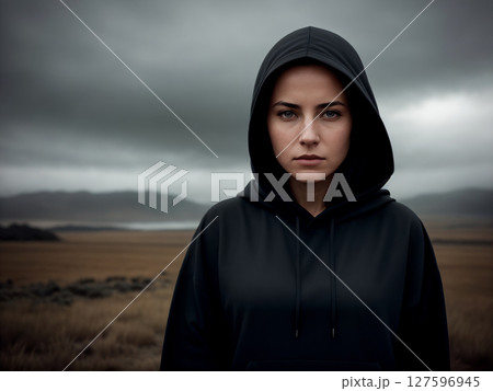 Dramatic portrait of a woman, late autumn season, wild landscape as background, dark sky with storm clouds. Generative AI.