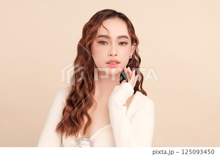 Beautiful young asian woman with clean fresh skin on beige background, Face care, Facial treatment, Cosmetology, beauty and spa, Asian women portrait.