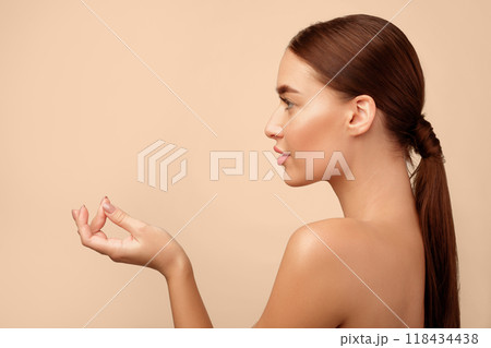 Beautiful young woman with clean fresh skin on beige background, Face care, Facial treatment, Cosmetology, beauty and spa, women portrait.