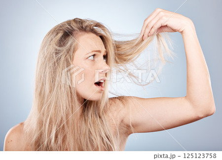Woman, shocked and hair care health or cosmetics wellness for hair loss in studio. Young blonde model, dry and messy hairsyle or girl upset for split ends or damaged hair in grey background studio