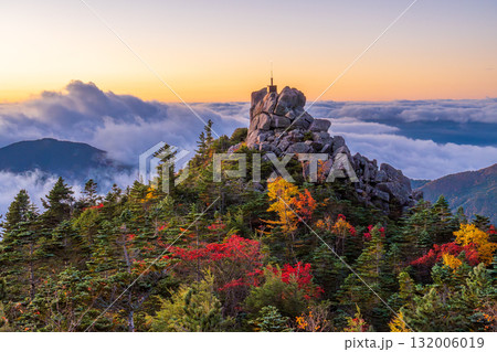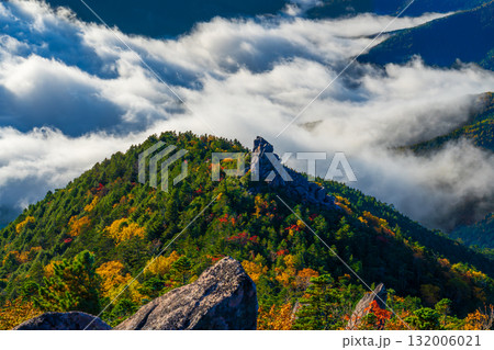 夜明けの奥秩父山塊天狗尾根から紅葉の天狗岩