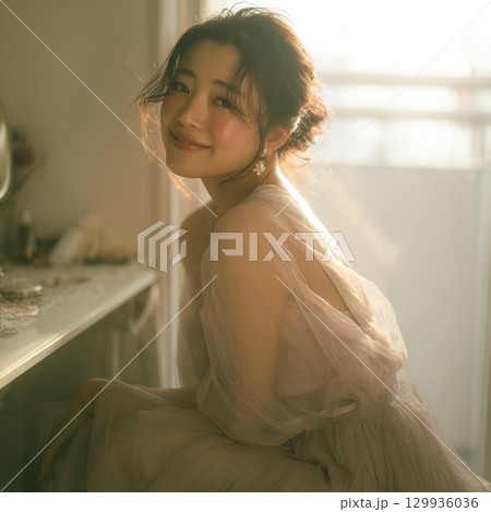 穏やかな笑顔で寄り添う女性のポートレート素材