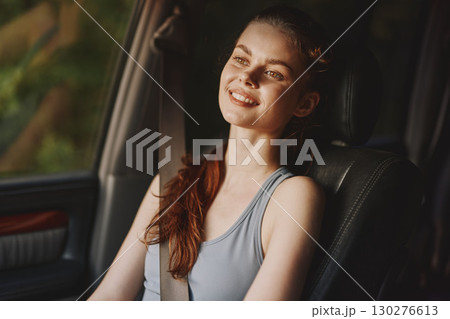 Smiling young woman with long hair in sporty attire, enjoying a sunny drive in a car, exuding happiness and relaxation, with a soft green background