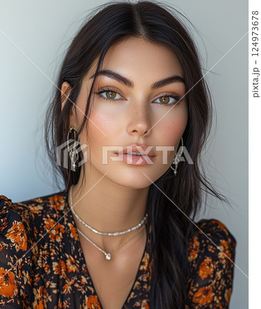Close-up Portrait of a Woman with Long Hair Wearing Floral Dress and Elegant Jewelry