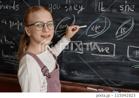 Portrait of Caucasian schoolgirl wearing eyeglasses looking at camera while writing on blackboard in classroom