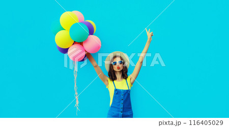 Summer, holiday, celebration, happy cheerful young woman with bright colorful balloons on blue