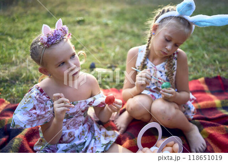 mother and baby sister watch as pre-teen girl in a summer dress paints a picture in the garden on an easel