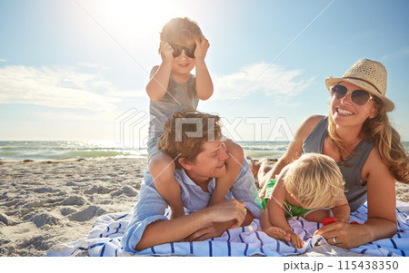 Portrait, piggyback or children with family at sea for vacation, holiday or summer together with parents. Father, mother or happy kids siblings at beach for bonding, love or playing by ocean to relax