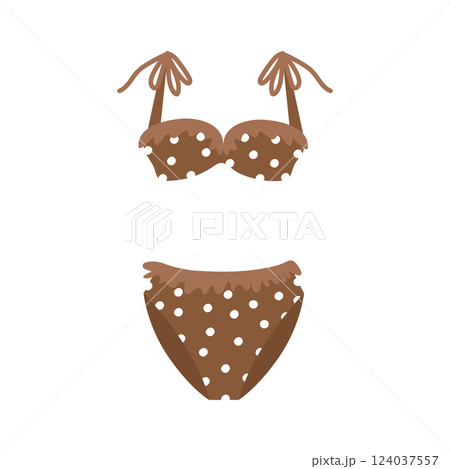 Separate women's swimsuit in brown polka dots with frilled cups and straps with ties. Fashionable illustration of clothes for sea holidays and sunbathing in hot summer.