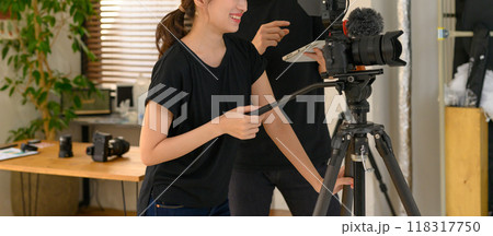 歌を歌う金髪ショートヘアの若い女性(コンデンサーマイク、録音、ボーカル、ナレーター)