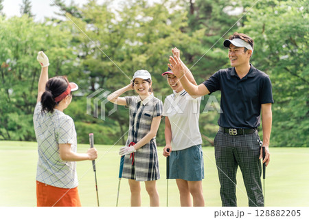 ゴルフ場でハイタッチするゴルフ仲間の男女