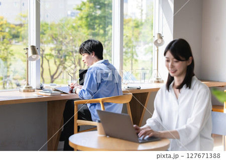 カフェで仕事をする女性